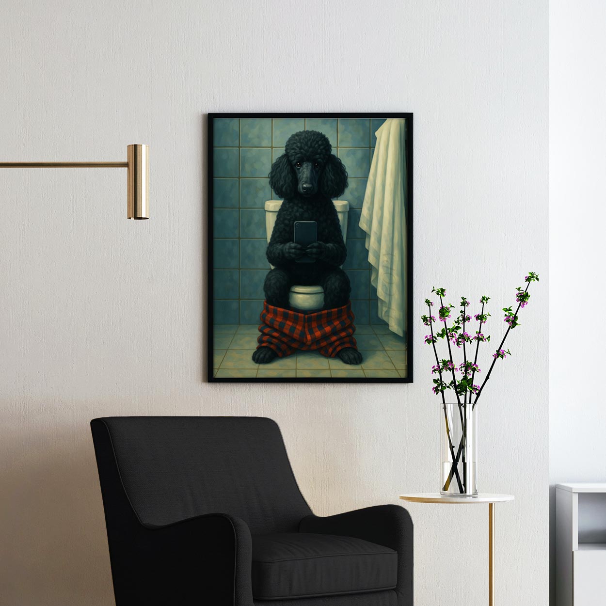 Black Poodle Dog On The Phone On The Toilet