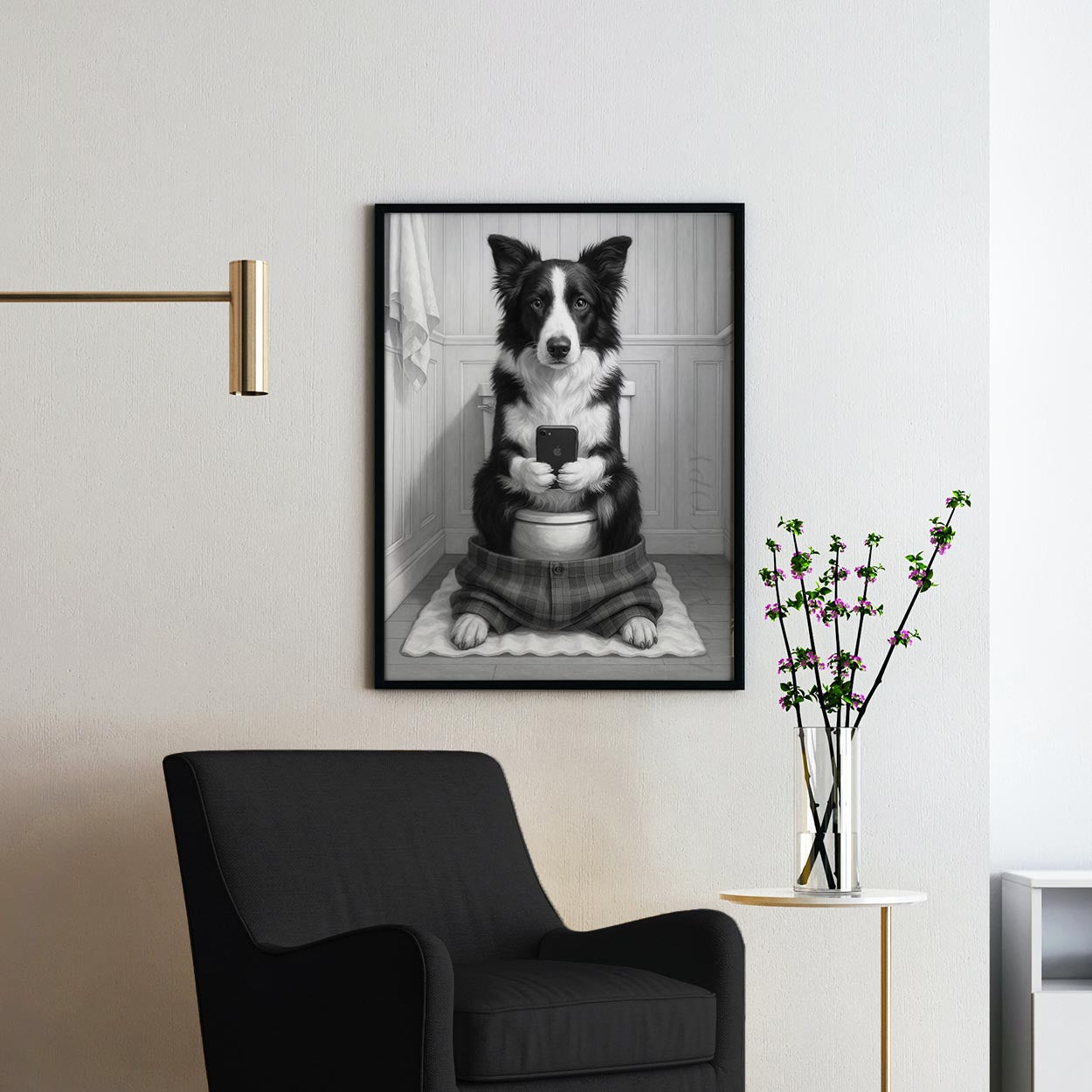 Border Collie Dog On The Phone On The Toilet
