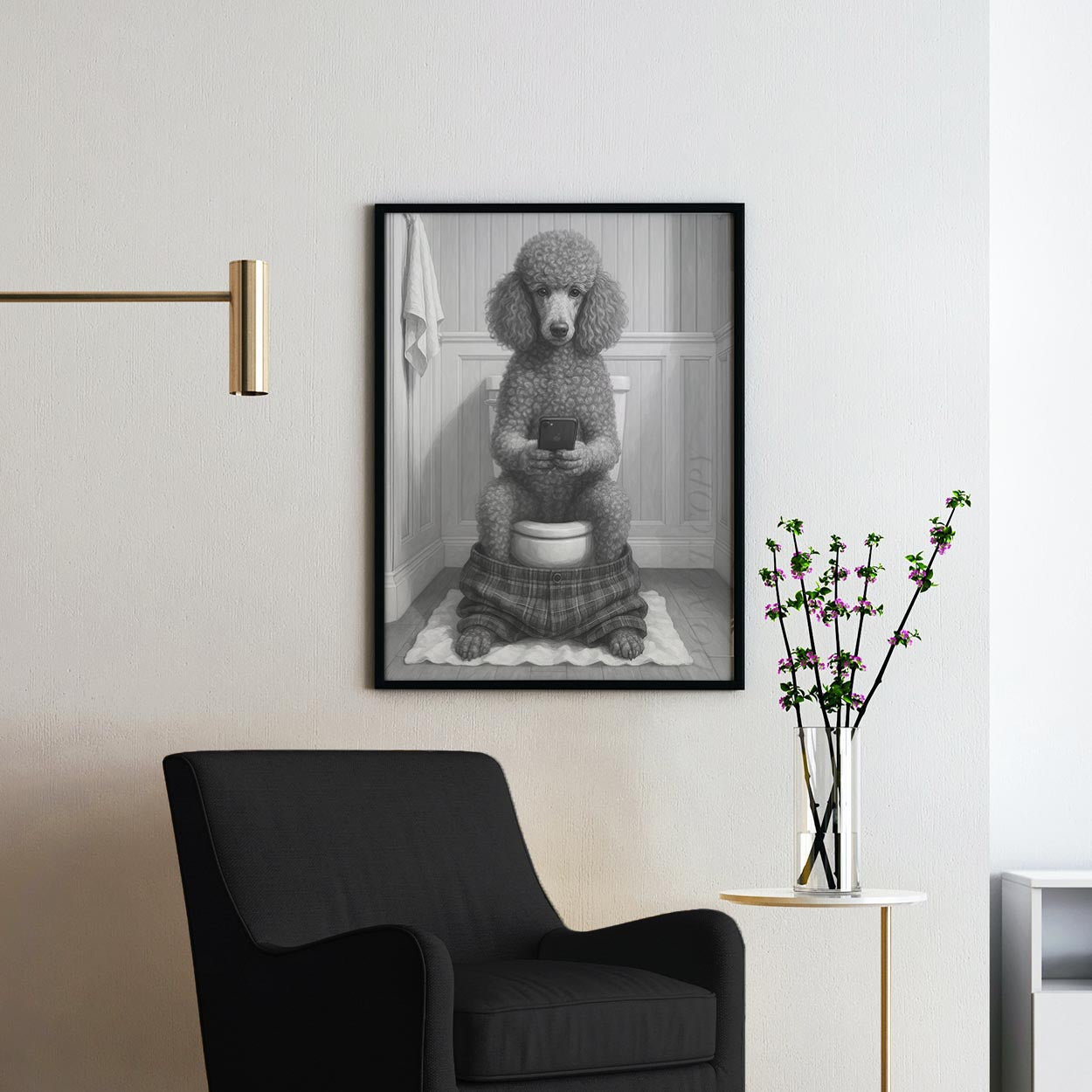 French Poodle Dog On The Phone On The Toilet