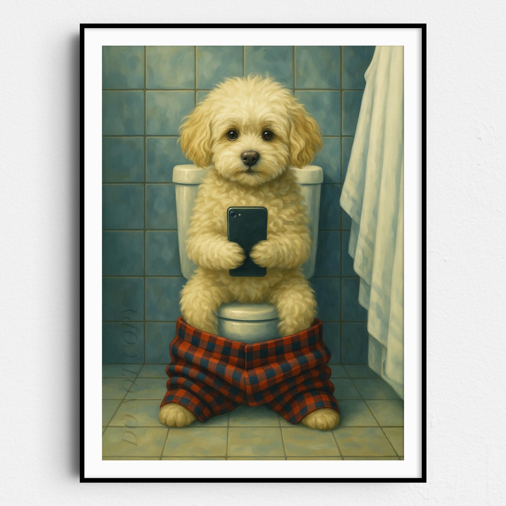Maltipoo Dog On The Phone On The Toilet