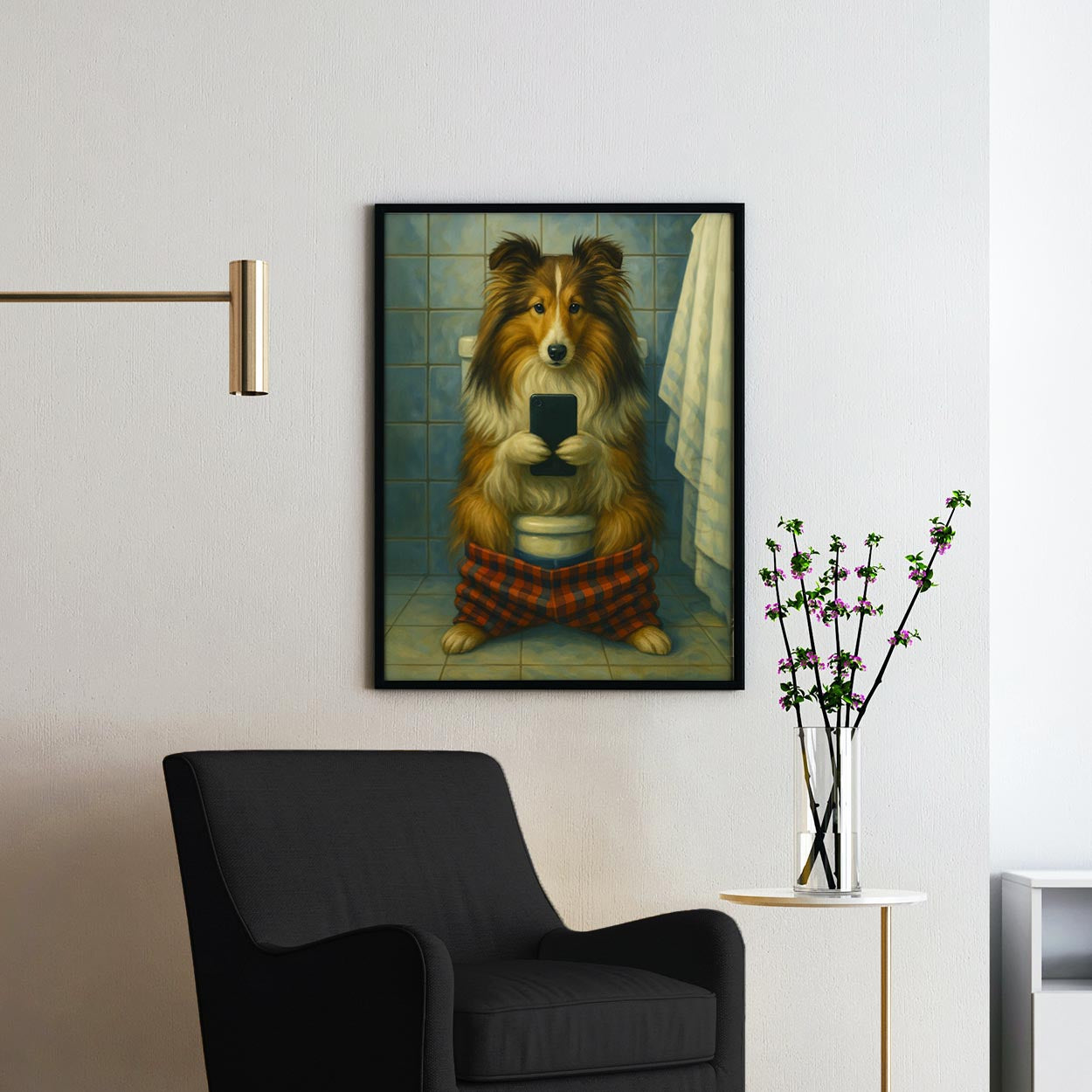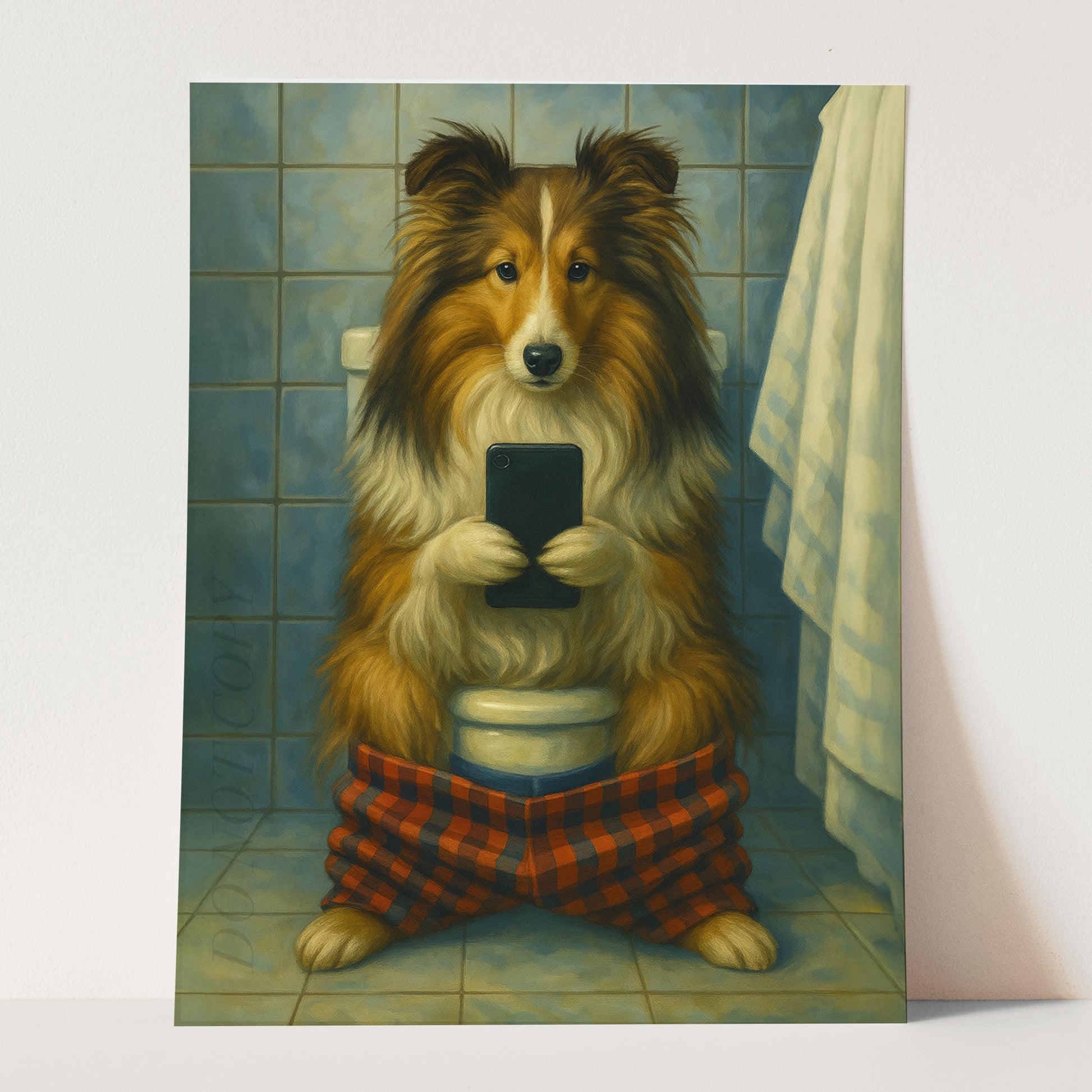Sheltie Dog On The Phone On The Toilet